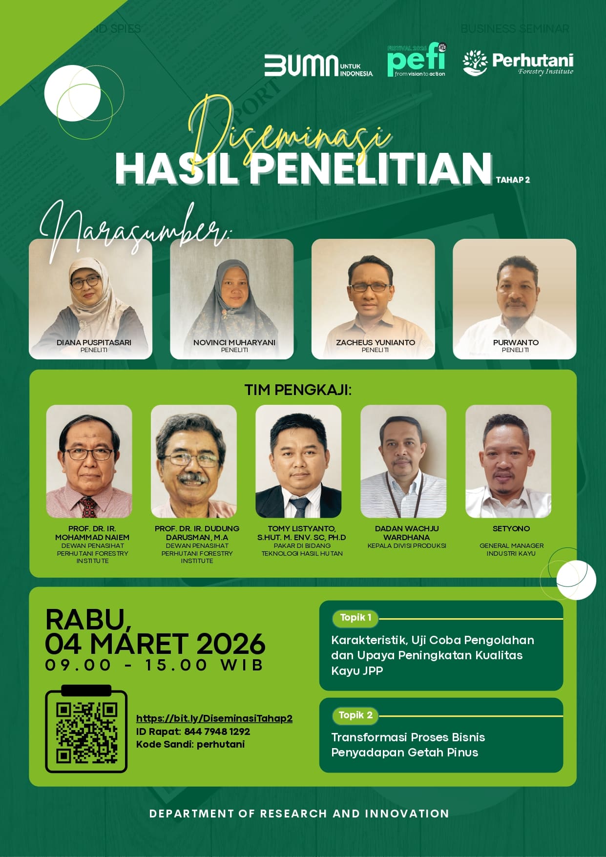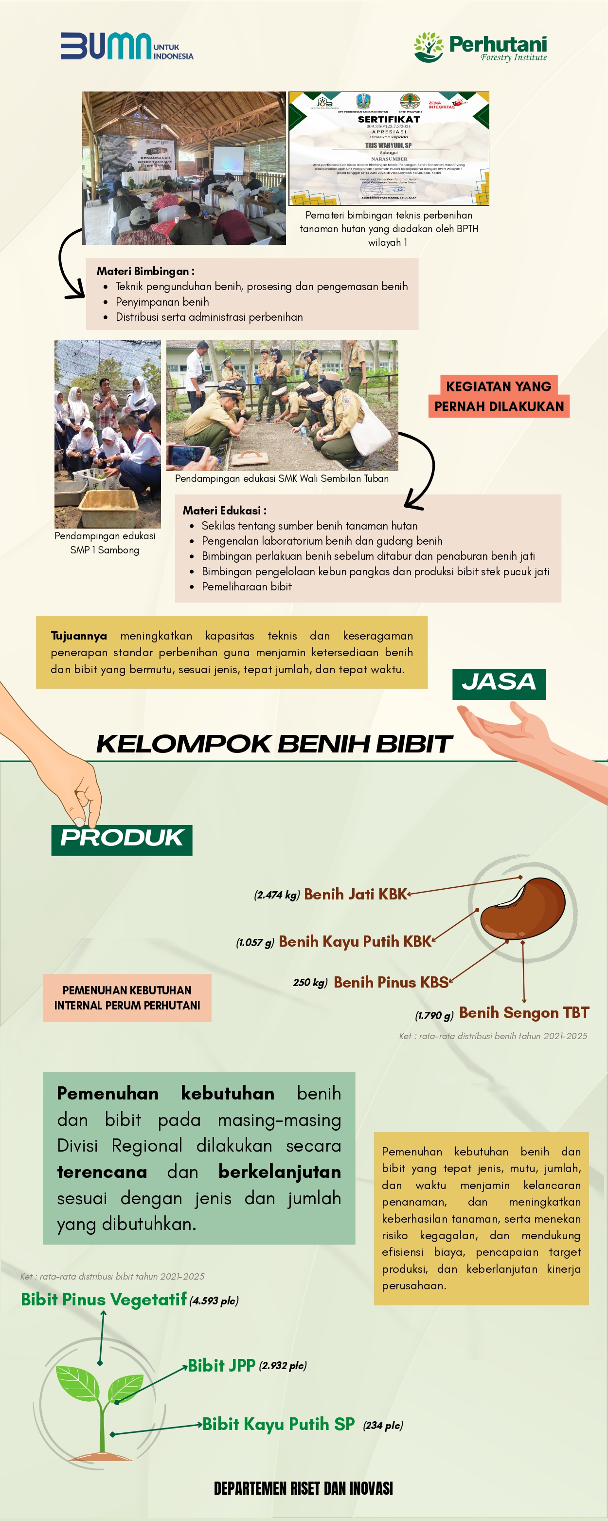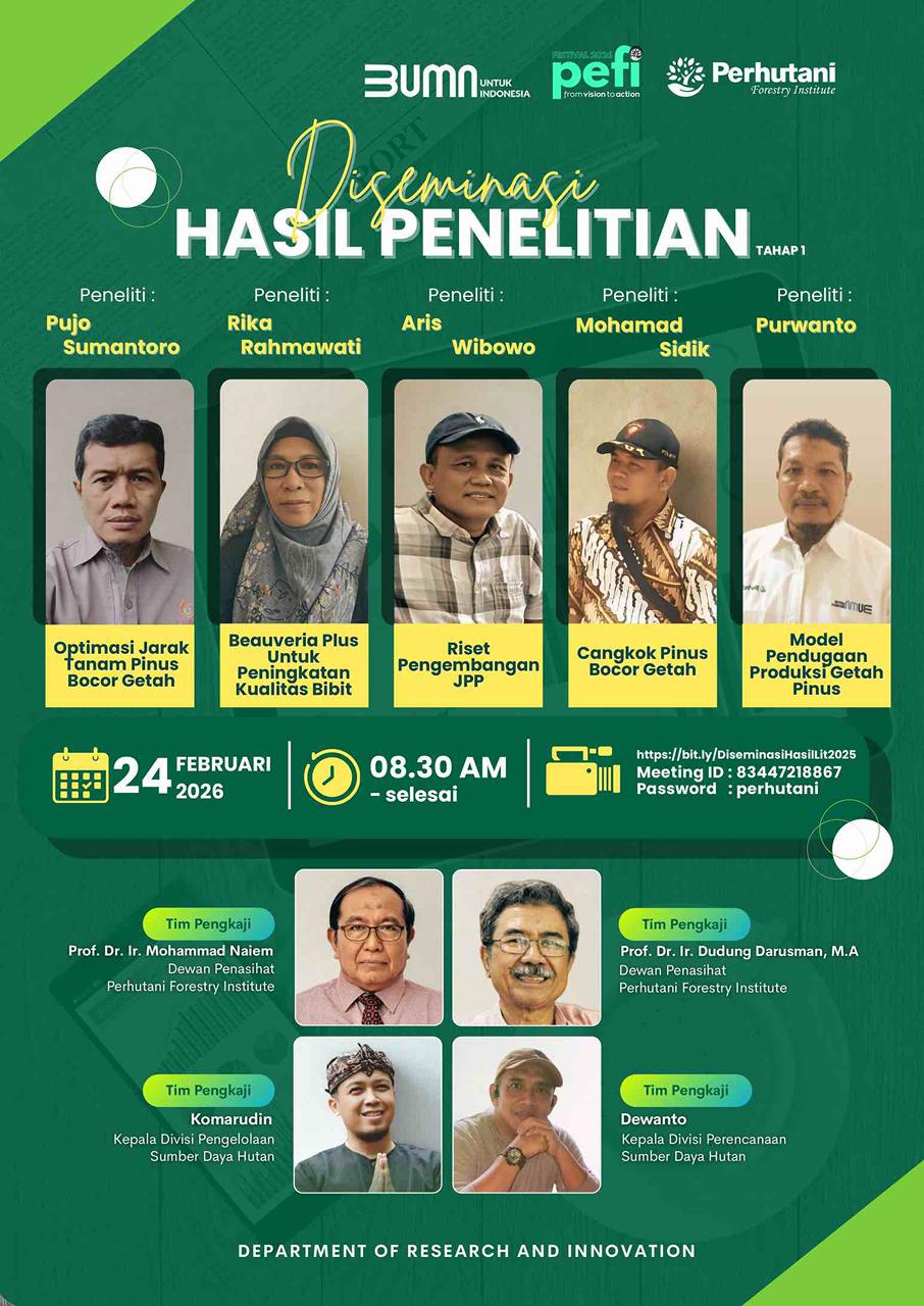 Mendorong inovasi berkelanjutan melalui riset terapan, pengembangan teknologi, dan publikasi ilmiah untuk keunggulan kompetitif Perhutani.